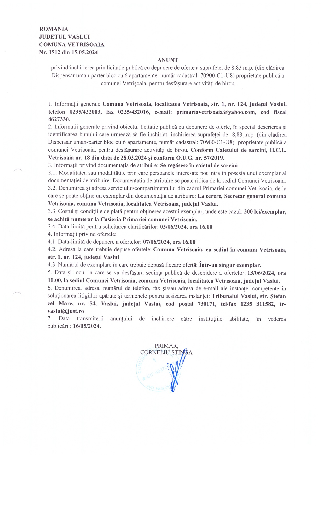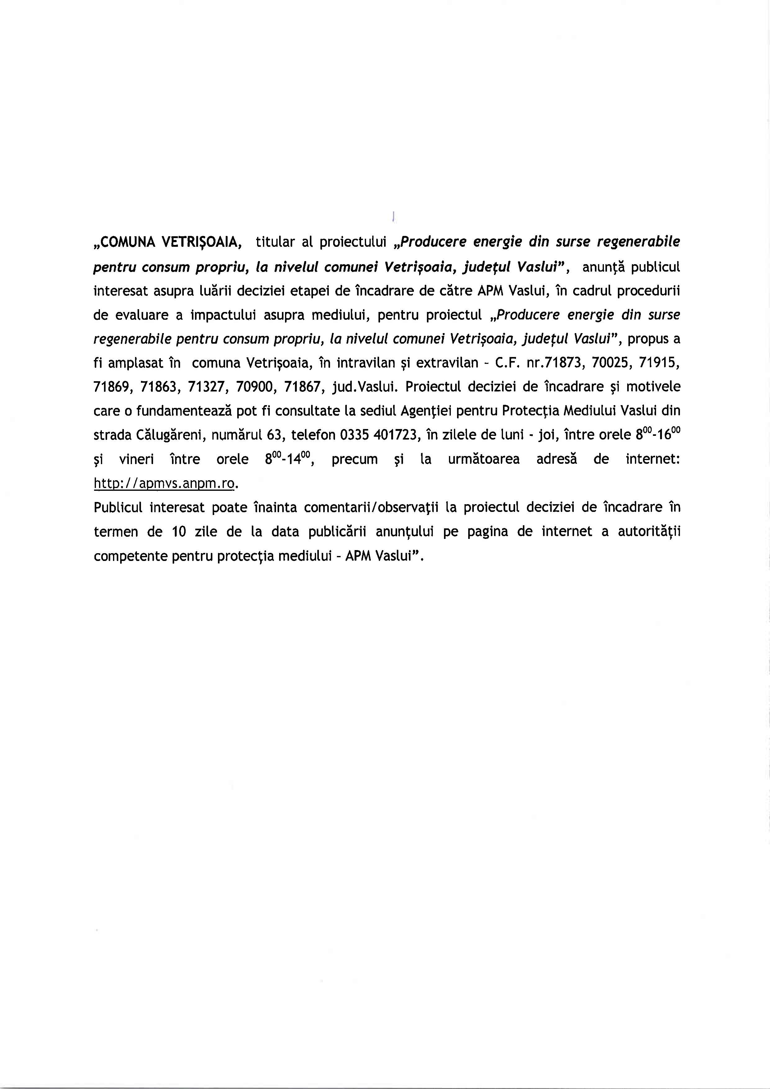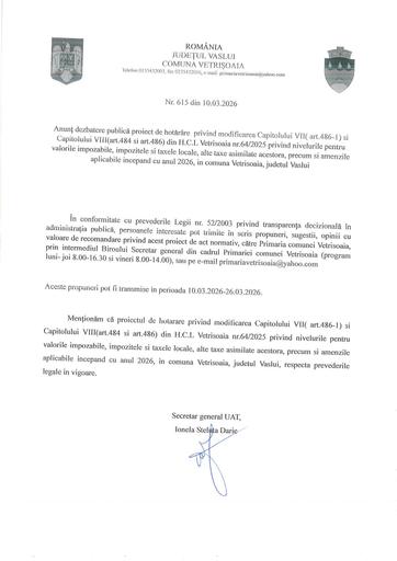Home » Anunturi publice Folder Anunturi publice Home » Anunturi publice » Adresa dezbatere publica buget initial 2025 pdf Adresa dezbatere publica buget initial 2025 Published on 11 March 2025 By vetri 625 downloads Download (pdf, 95 KB) adresa dezbatere publica buget initial 2025 (1).pdf Home » Anunturi publice » Anunt dezbatere publica proiect de hotarare privind modificarea capitolului VIIdin HCL 64 2025 pdf Anunt dezbatere publica proiect de hotarare privind modificarea capitolului VIIdin HCL 64 2025 Published on 11 March 2026 Modified on 11 March 2026 By vetri 41 downloads Download (pdf, 4.01 MB) Anunt dezbatere publica proiect de hotarare privind modificarea capitolului VIIdin HCL 64-2025.pdf Home » Anunturi publice » Anunt inchiriere spatiu Image Anunt inchiriere spatiu Published on 17 May 2024 By vetri 1602 downloads Download (jpg, 462 KB) Anunt inchiriere spatiu.jpg Home » Anunturi publice » Anunt inchiriere sptiu statie autobuz pdf Anunt inchiriere sptiu statie autobuz Published on 02 July 2024 By vetri 1173 downloads Download (pdf, 148 KB) anunt inchiriere sptiu statie autobuz.pdf Home » Anunturi publice » Anunt licitatie Image Anunt licitatie Published on 01 August 2025 Modified on 31 July 2025 By vetri 409 downloads Download (jpg, 585 KB) anunt licitatie (1) (1) (1) (1).jpg Home » Anunturi publice » Anunt privind proiect fotovoltaice UAT pdf Anunt privind proiect fotovoltaice UAT Published on 13 March 2024 By vetri 1379 downloads Download (pdf, 68 KB) anunt privind proiect fotovoltaice UAT.pdf Home » Anunturi publice » Anunt public delimitarea sectiilor de votare pdf Anunt public delimitarea sectiilor de votare Published on 25 October 2024 By vetri 873 downloads Download (pdf, 163 KB) Anunt public delimitarea sectiilor de votare.pdf Home » Anunturi publice » Anunt public proiect Investitii in noi suprafete ocupate de Paduri pdf Anunt public proiect Investitii in noi suprafete ocupate de Paduri Published on 29 October 2024 By vetri 785 downloads Download (pdf, 65 KB) Anunt public proiect – Investitii in noi suprafete ocupate de Paduri.pdf Home » Anunturi publice » CALENDAR LICITATIE statie autobuz pdf CALENDAR LICITATIE statie autobuz Published on 02 July 2024 By vetri 1265 downloads Download (pdf, 129 KB) CALENDAR LICITATIE statie autobuz.pdf Home » Anunturi publice » Dispozitie privind stabilirea locurilor speciale pentru afisaj electoral pdf Dispozitie privind stabilirea locurilor speciale pentru afisaj electoral Published on 17 March 2025 By vetri 722 downloads Download (pdf, 958 KB) Dispozitie privind stabilirea locurilor speciale pentru afisaj electoral.pdf Home » Anunturi publice » Dispozitie stabilirea locuri speciale afisaj electoral pdf Dispozitie stabilirea locuri speciale afisaj electoral Published on 25 October 2024 By vetri 777 downloads Download (pdf, 118 KB) Dispozitie stabilirea locuri speciale afisaj electoral.pdf Home » Anunturi publice » Informare privind schimbarea categoriei de folosinta a terenurilor situate in extravilanul localitatilor pdf Informare privind schimbarea categoriei de folosinta a terenurilor situate in extravilanul localitatilor Published on 05 March 2026 Modified on 05 March 2026 By vetri 45 downloads Download (pdf, 554 KB) Informare privind schimbarea categoriei de folosinta a terenurilor situate in extravilanul localitatilor.pdf Home » Anunturi publice » Proiect -Producerea energie din surse regenerabile pentru consum propriu la nivelul comunei Vetrisoaia, judetul Vaslui Image Proiect -Producerea energie din surse regenerabile pentru consum propriu la nivelul comunei Vetrisoaia, judetul Vaslui Published on 26 March 2024 By vetri 1508 downloads Download (jpg, 394 KB) Proiect_Page_1.jpg Home » Anunturi publice » Promovarea Programului start-up Nation-Romania, editia 2024 pdf Promovarea Programului start-up Nation-Romania, editia 2024 Published on 23 February 2026 Modified on 23 February 2026 By vetri 43 downloads Download (pdf, 4.25 MB) IMG_0001.pdf Home » Anunturi publice » Sprijin pentru persoanele defavorizate in vederea asigurarii alimentelor de baza mese calde pdf Sprijin pentru persoanele defavorizate in vederea asigurarii alimentelor de baza mese calde Published on 18 February 2026 Modified on 18 February 2026 By vetri 76 downloads Download (pdf, 221 KB) Sprijin pentru persoanele defavorizate in vederea asigurarii alimentelor de baza-mese calde..pdf