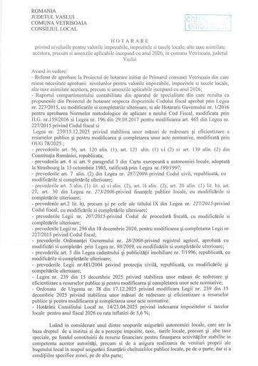 Home » MONITORUL OFICIAL LOCAL » HOTĂRÂRILE AUTORITĂȚII DELIBERATIVE » Hotărârile autorității deliberative » Hotărârile Autorității Deliberative – Anul 2025 Folder Hotărârile Autorității Deliberative – Anul 2025 Home » MONITORUL OFICIAL LOCAL » HOTĂRÂRILE AUTORITĂȚII DELIBERATIVE » Hotărârile autorității deliberative » Hotărârile Autorității Deliberative – Anul 2025 » HCL 1 pdf HCL 1 Published on 12 February 2025 By vetri 182 downloads Download (pdf, 449 KB) HCL 1.PDF Home » MONITORUL OFICIAL LOCAL » HOTĂRÂRILE AUTORITĂȚII DELIBERATIVE » Hotărârile autorității deliberative » Hotărârile Autorității Deliberative – Anul 2025 » HCL 2 pdf HCL 2 Published on 12 February 2025 By vetri 291 downloads Download (pdf, 221 KB) HCL 2.PDF Home » MONITORUL OFICIAL LOCAL » HOTĂRÂRILE AUTORITĂȚII DELIBERATIVE » Hotărârile autorității deliberative » Hotărârile Autorității Deliberative – Anul 2025 » HCL 3 pdf HCL 3 Published on 12 February 2025 By vetri 190 downloads Download (pdf, 488 KB) HCL 3.PDF Home » MONITORUL OFICIAL LOCAL » HOTĂRÂRILE AUTORITĂȚII DELIBERATIVE » Hotărârile autorității deliberative » Hotărârile Autorității Deliberative – Anul 2025 » HCL 4 pdf HCL 4 Published on 12 February 2025 By vetri 174 downloads Download (pdf, 6.46 MB) HCL 4.PDF Home » MONITORUL OFICIAL LOCAL » HOTĂRÂRILE AUTORITĂȚII DELIBERATIVE » Hotărârile autorității deliberative » Hotărârile Autorității Deliberative – Anul 2025 » HCL 5 pdf HCL 5 Published on 12 February 2025 By vetri 183 downloads Download (pdf, 225 KB) HCL 5.PDF Home » MONITORUL OFICIAL LOCAL » HOTĂRÂRILE AUTORITĂȚII DELIBERATIVE » Hotărârile autorității deliberative » Hotărârile Autorității Deliberative – Anul 2025 » HCL 6 pdf HCL 6 Published on 12 February 2025 By vetri 208 downloads Download (pdf, 783 KB) HCL 6.PDF Home » MONITORUL OFICIAL LOCAL » HOTĂRÂRILE AUTORITĂȚII DELIBERATIVE » Hotărârile autorității deliberative » Hotărârile Autorității Deliberative – Anul 2025 » HCL actualizare deviz pdf HCL actualizare deviz Published on 04 June 2025 Modified on 04 June 2025 By vetri 106 downloads Download (pdf, 101 KB) HCL actualizare deviz.pdf Home » MONITORUL OFICIAL LOCAL » HOTĂRÂRILE AUTORITĂȚII DELIBERATIVE » Hotărârile autorității deliberative » Hotărârile Autorității Deliberative – Anul 2025 » HCL aprobare indicatori tehnico economici Document HCL aprobare indicatori tehnico economici Published on 24 July 2025 Modified on 24 July 2025 By vetri 93 downloads Download (docx, 24 KB) HCL aprobare indicatori tehnico-economici.docx Home » MONITORUL OFICIAL LOCAL » HOTĂRÂRILE AUTORITĂȚII DELIBERATIVE » Hotărârile autorității deliberative » Hotărârile Autorității Deliberative – Anul 2025 » HCL SI TABLOU IMPOZITE SI TAXE 2026 pdf HCL SI TABLOU IMPOZITE SI TAXE 2026 Published on 13 January 2026 Modified on 13 January 2026 By vetri 53 downloads Download (pdf, 16.84 MB) HCL SI TABLOU IMPOZITE SI TAXE 2026.PDF Home » MONITORUL OFICIAL LOCAL » HOTĂRÂRILE AUTORITĂȚII DELIBERATIVE » Hotărârile autorității deliberative » Hotărârile Autorității Deliberative – Anul 2025 » HOTARARE ILUMINAT STRADAL pdf HOTARARE ILUMINAT STRADAL Published on 04 June 2025 By vetri 105 downloads Download (pdf, 92 KB) HOTARARE ILUMINAT STRADAL.pdf Home » MONITORUL OFICIAL LOCAL » HOTĂRÂRILE AUTORITĂȚII DELIBERATIVE » Hotărârile autorității deliberative » Hotărârile Autorității Deliberative – Anul 2025 » HOTARARE PRIVIND APROBARE REGULAMENT pdf HOTARARE PRIVIND APROBARE REGULAMENT Published on 04 June 2025 By vetri 118 downloads Download (pdf, 243 KB) HOTARARE PRIVIND APROBARE REGULAMENT.pdf Home » MONITORUL OFICIAL LOCAL » HOTĂRÂRILE AUTORITĂȚII DELIBERATIVE » Hotărârile autorității deliberative » Hotărârile Autorității Deliberative – Anul 2025 » Hotarare privind aprobarea contului de executie a bugetului de venituri si cheltuieli aferent bugetului local 31 martie 2025 pdf Hotarare privind aprobarea contului de executie a bugetului de venituri si cheltuieli aferent bugetului local 31 martie 2025 Published on 04 June 2025 By vetri 106 downloads Download (pdf, 93 KB) Hotarare privind aprobarea contului de executie a bugetului de venituri si cheltuieli aferent bugetului local 31 martie 2025.pdf Home » MONITORUL OFICIAL LOCAL » HOTĂRÂRILE AUTORITĂȚII DELIBERATIVE » Hotărârile autorității deliberative » Hotărârile Autorității Deliberative – Anul 2025 » Hotarare privind completarea Hotararii Consiliului Local Vetrisoaia nr 61-2020 pentru aprobarea strategiei de dezvoltare a comunei Vetrișoaia, pentru perioada 2021 20 pdf Hotarare privind completarea Hotararii Consiliului Local Vetrisoaia nr 61-2020 pentru aprobarea strategiei de dezvoltare a comunei Vetrișoaia, pentru perioada 2021 20 Published on 20 March 2025 By vetri 169 downloads Download (pdf, 159 KB) Hotarare privind completarea Hotararii Consiliului Local Vetrisoaia nr. 612020 pentru aprobarea strategiei de dezvoltare a comunei Vetrișoaia, pentru perioada 2021-20.pdf Home » MONITORUL OFICIAL LOCAL » HOTĂRÂRILE AUTORITĂȚII DELIBERATIVE » Hotărârile autorității deliberative » Hotărârile Autorității Deliberative – Anul 2025 » HOTARARE PRIVIND INVENTARIEREA MATERIEI IMPOZABILE PENTRU ANUL 2026 pdf HOTARARE PRIVIND INVENTARIEREA MATERIEI IMPOZABILE PENTRU ANUL 2026 Published on 04 June 2025 By vetri 106 downloads Download (pdf, 93 KB) HOTARARE PRIVIND INVENTARIEREA MATERIEI IMPOZABILE PENTRU ANUL 2026.pdf Home » MONITORUL OFICIAL LOCAL » HOTĂRÂRILE AUTORITĂȚII DELIBERATIVE » Hotărârile autorității deliberative » Hotărârile Autorității Deliberative – Anul 2025 » HOTARARE PRIVIND ORGANIZAREA SI FINATAREA MANIFESTARILOR CULTURAL ARTISTIECE DE INALTAREA DOMNULUI SI ZIUA COPILULUI pdf HOTARARE PRIVIND ORGANIZAREA SI FINATAREA MANIFESTARILOR CULTUR